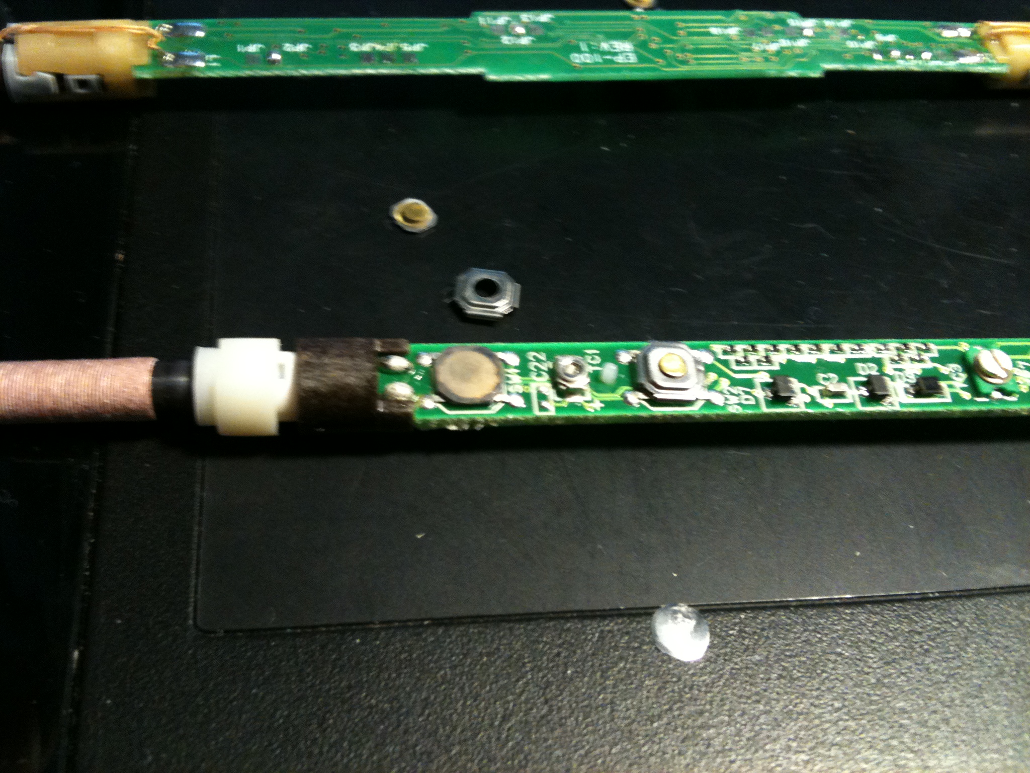 여튼 위의 사진에서 보시는 것처럼 버튼 부분을 고정시켜주는 쇠 부분이 휘어져 누름쇠가 고정이 안되어 눌리지 않는 것일 뿐 누름쇠를 버튼 위에 두고 클릭하면 이상 없이 작동합니다. 당연한 것이 기판에 납땜 되어 고정되어 있는 것이 부숴진 것이 아니라 단지 위에 있는 고정쇠 부분이 휘어져 고정이 안 되는 것일 뿐이니까요.